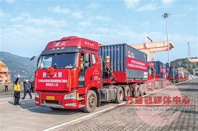 1月4日,在重庆万州新田港站,工作人员驾驶集装箱卡车,运送已转运至公路物流环节的专列货物。